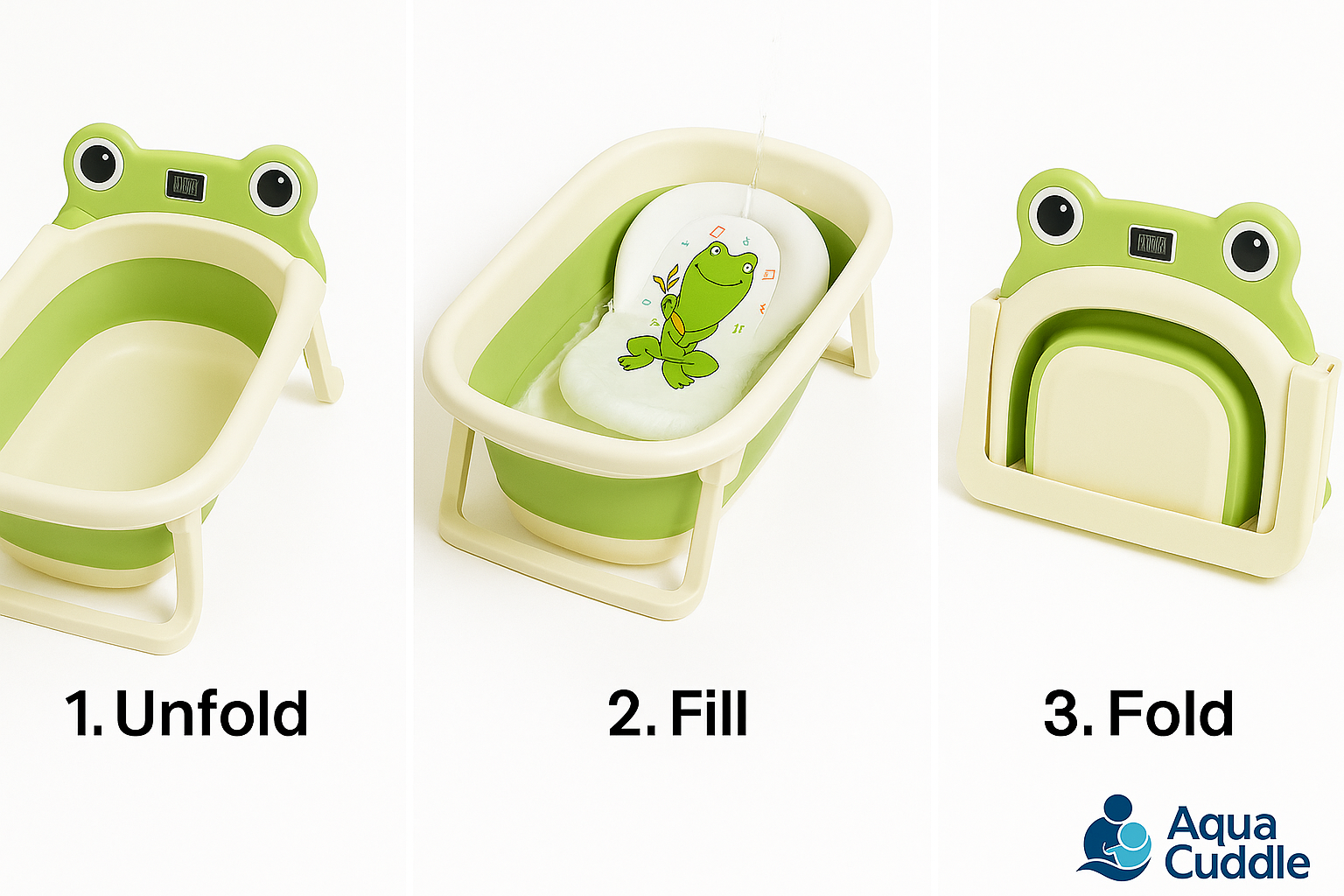 AquaCuddle makes bath time simple — unfold, fill, and fold again in seconds